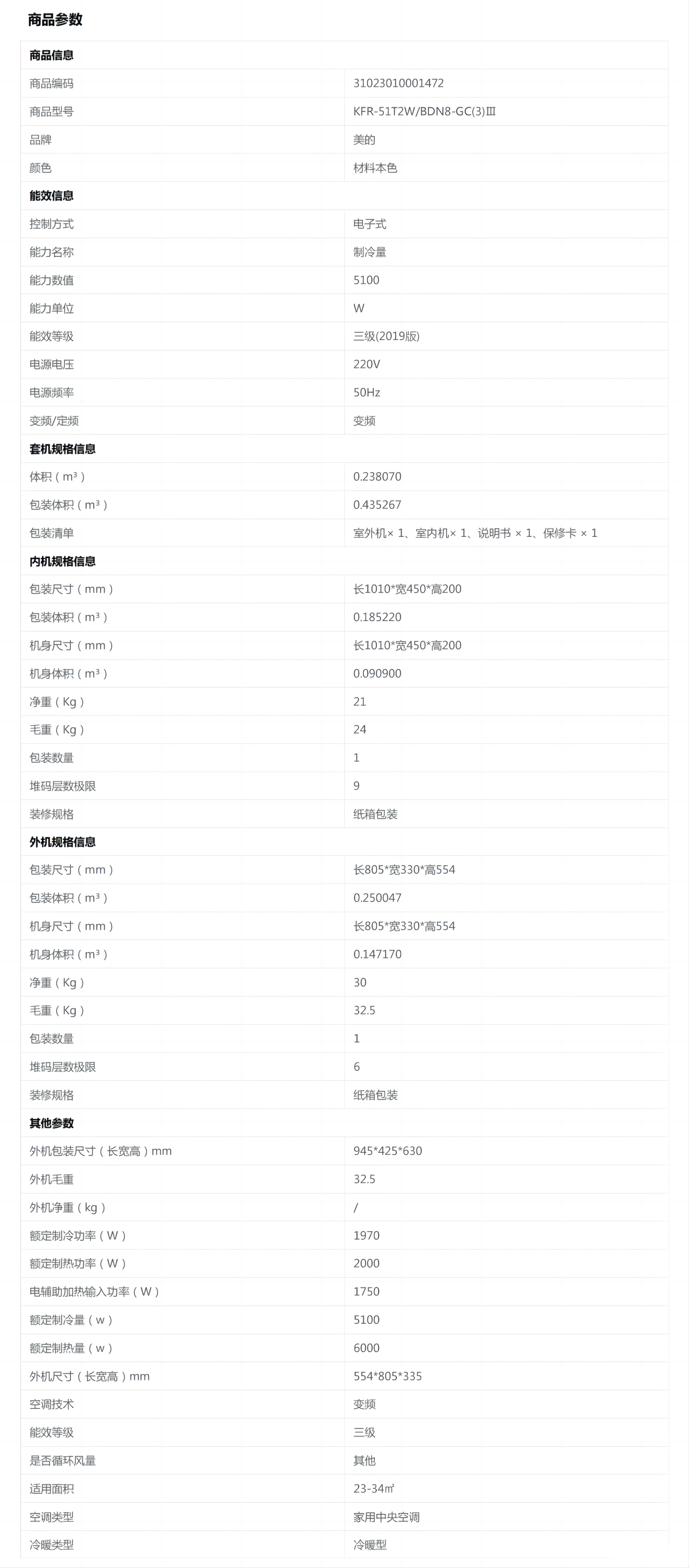 美的 2匹 冷暖变频三级能效风管式套机 KFR-51T2W/BDN8-GC(3)Ⅲ