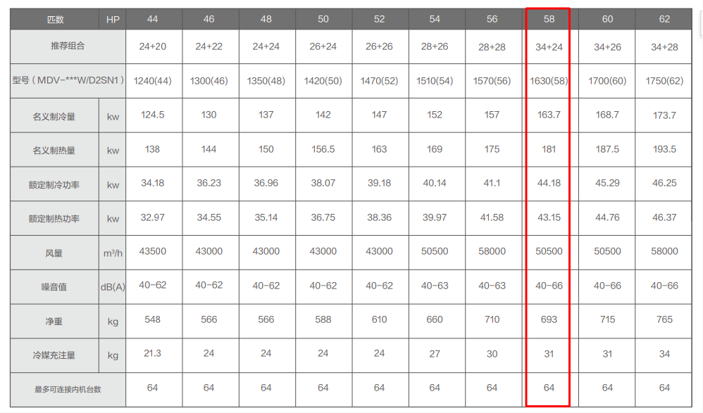制冷量:163.7KW 制热量:181KW